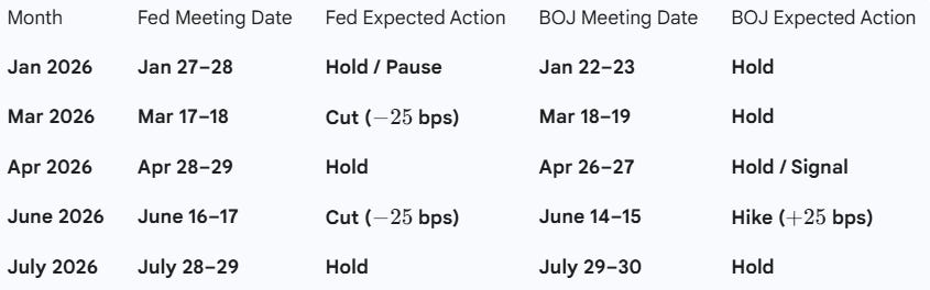 While current measures may protect the market through the holidays, a structural risk emerges in the 1st half of 2026. Jerome Powell’s term as Fed Chair ends on May 15, 2026. This leadership transition occurs just weeks before a projected "collision" in global interest rates. If the Fed continues to cut while the BOJ continues to hike, the interest rate gap will vanish entirely. Below table shows the next 5 meetings and the expected decision.