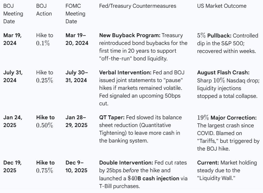The following table details the major Japanese rate hikes of the last two years and the specific “emergency” measures the US government used to stabilize the markets.