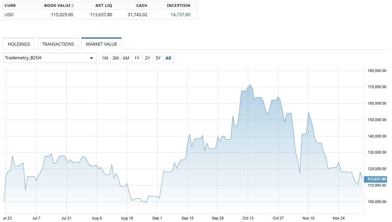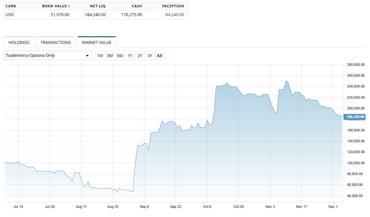Launched July 7 with 100k. It is currently up about 84% as of Dec 5 market close. This is a large drawdown from the October peak where it was up more than 140%.