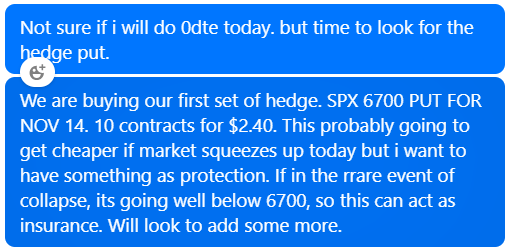 I only bought 10 puts. I planned to add more but let the bullish bias stop me. Here is what I posted after market close on Nov 12 and how I decided not to buy additional put hedges that night after the vote.