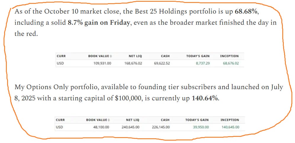 I’m making this update public so everyone can see exactly what happened during a bad November. After having a green month every month this year, November was my first losing month, and it wasn’t pretty. I backed away from my original hedge plan at the last minute, and the portfolio paid the price with a preventable drawdown. Most substackers, including the top ones, had a bad month but they don’t want to talk about it. But unlike others, I will lay it out for everyone to see.
