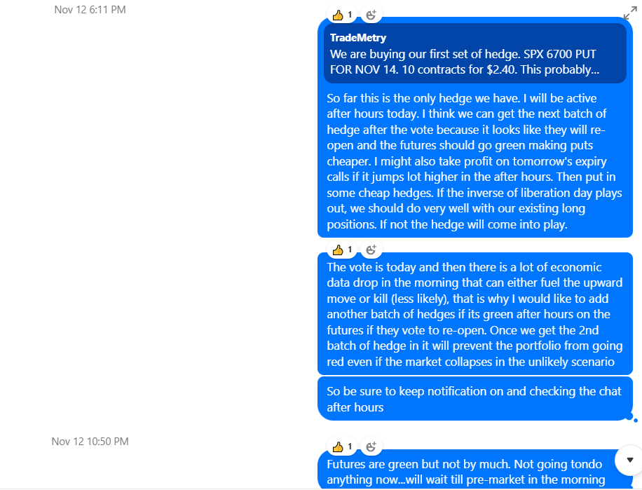 At first it looked perfect. The early November dip reversed quickly and everything turned green. Going into the November 12 government funding vote, I was heavily long AI names, crypto-linked names, thematic names, and I added cheap 6950 and 6900 calls that were up multiples.