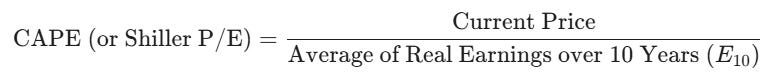 Shiller P/E, also called CAPE (Cyclically Adjusted Price-to-Earnings), is a version of the P/E ratio designed to smooth out short-term economic ups and downs. Instead of relying on only last year’s earnings, it uses the average of inflation-adjusted earnings over the past 10 years (lets call it E10), and then compares today’s stock price (or index level) to that long-term earnings average.
