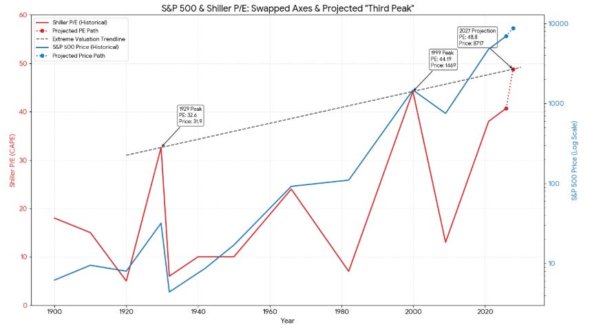 And according to that line, the S&P 500 isn’t done. The math points to a third peak that is higher, later, and more violent than consensus expects.